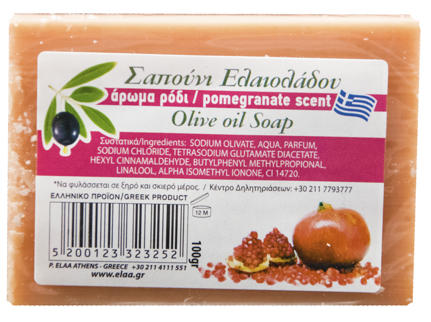 Σαπούνι από λάδι ελιάς, 100% φυσικό προϊόν, περιέχει ελαιόλαδο πλούσιο σε βιταμίνες Ε και Α, διαθέτει μαλακτικές και ενυδατικές ιδιότητες. Το ελαιόλαδο αναζωογονεί τέλεια το δέρμα και το καταπραΰνει. Με άρωμα ροδιού, ευχάριστο, γλυκό και ελκυστικό, χαρίζει την αίσθηση δροσιάς και φρεσκάδας. Δεν επηρεάζει το pH του δέρματος.