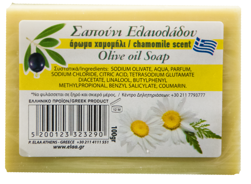 Σαπούνι από λάδι ελιάς, 100% φυσικό προϊόν, περιέχει ελαιόλαδο πλούσιο σε βιταμίνες Ε και Α, διαθέτει μαλακτικές και ενυδατικές ιδιότητες. Το ελαιόλαδο αναζωογονεί τέλεια το δέρμα και το καταπραΰνει. Με άρωμα Χαμομήλι, απαλό, αγνό και ευχάριστο, χαρίζει την αίσθηση ξεκούρασης και ηρεμίας. Δεν επηρεάζει το pH του δέρματος.