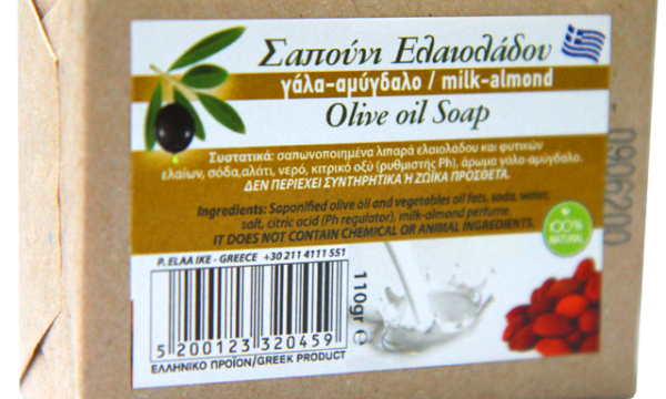 Σαπούνι από λάδι ελιάς, 100% φυσικό προϊόν, περιέχει ελαιόλαδο πλούσιο σε βιταμίνες Ε και Α, διαθέτει μαλακτικές και ενυδατικές ιδιότητες. Το ελαιόλαδο αναζωογονεί τέλεια το δέρμα και το καταπραΰνει. Με υπέροχο άρωμα γάλα - αμύγδαλο, απαλό, αγνό και ευχάριστο, χαρίζει την αίσθηση ξεκούρασης και ηρεμίας. Δεν επηρεάζει το pH του δέρματος.